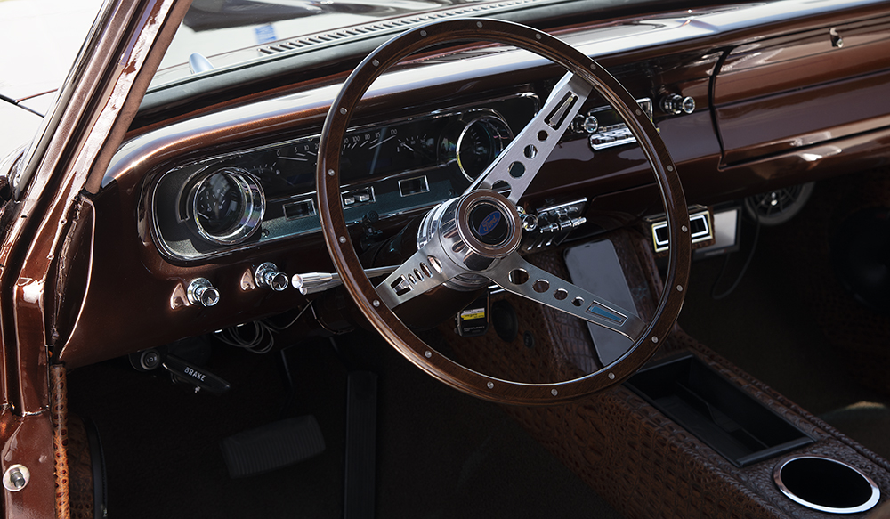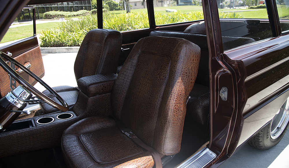 The Falcon's door panels and seat upholstery are no longer covered in Ford factory vinyl. It's as if the vinyl was all eaten by a crocodile who then died from the musty old vinyl toxicity and remained covering the seats and the doors. In reality, those hides are a brown hue of leather that are faux crocodile, which looks pretty spectacular.
