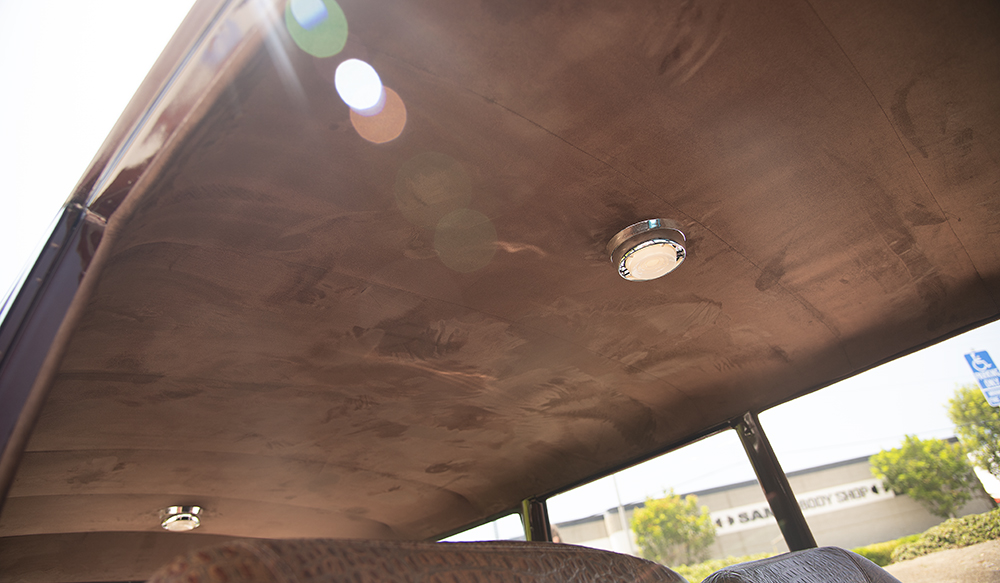 Above: The Falcon's headliner is now a luxurious brown suede leather covering. Superb.