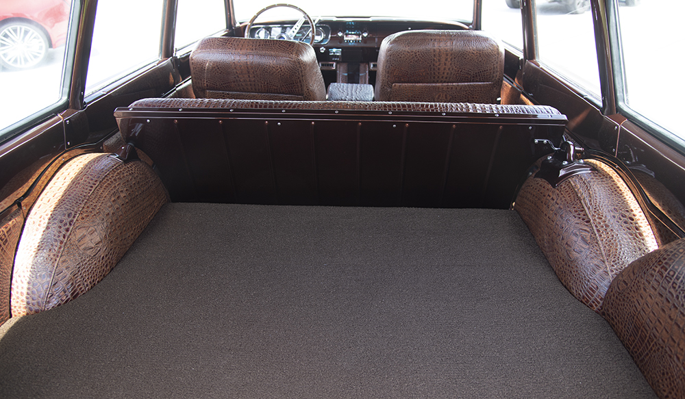 Above: American English slang for the area behind the back seat in a station wagon is the wayback area. Covered in a nice carpet and 'croc' leather on the sides, this Falcon wagon has much nicer interior appointments than any factory fresh Ford Falcon wagon wayback area from the 1960's.