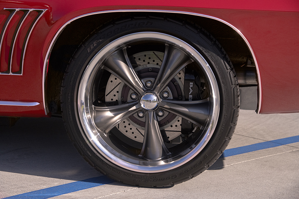 The Holloways hired Westside Garage in Orange, CA for the work. Since the goal was to make sure that the Camaro would be reliable, they decided to renew the entire drivetrain, including the cooling system, the driveshaft, the exhaust, the rear axle/differential, the fuel tank, replace the car's original wiring harness, etc. Though the Camaro already had front and rear Baer disc brakes, they went all in and replaced the front and rear subframes with new control arms and suspension components.