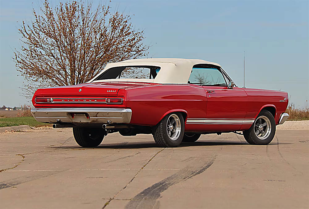 Above and below: The third generation 1966 Mercury Comet convertible above sports American Racing Torq-Thrust D wheels, has a 390-cubic inch V8, a four-speed manual transmission, and a red vinyl interior.