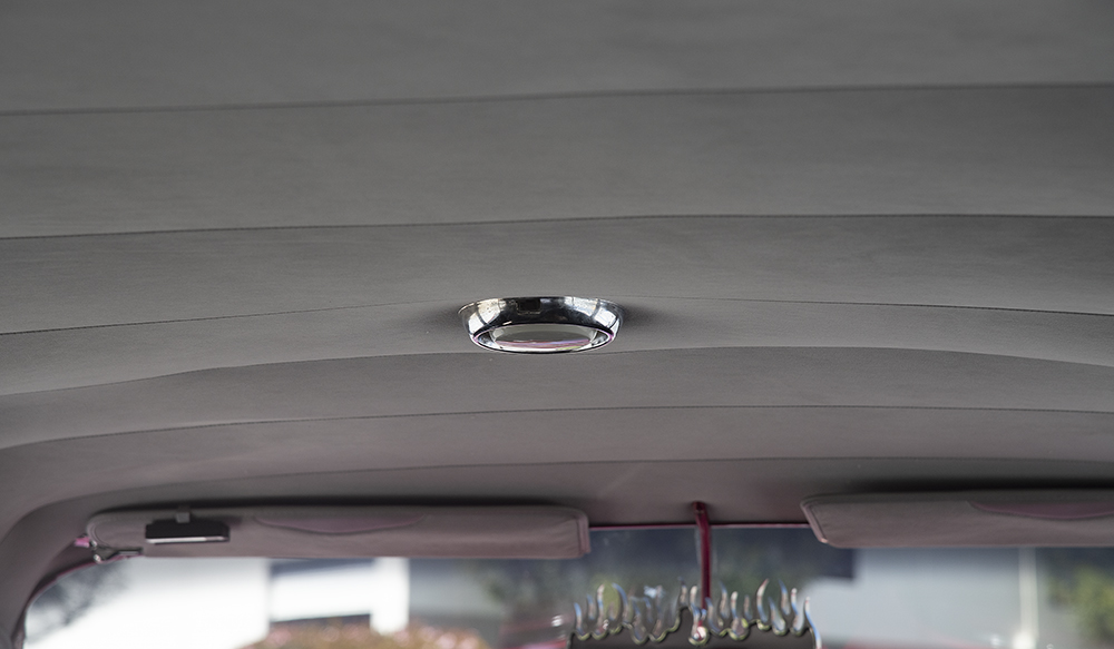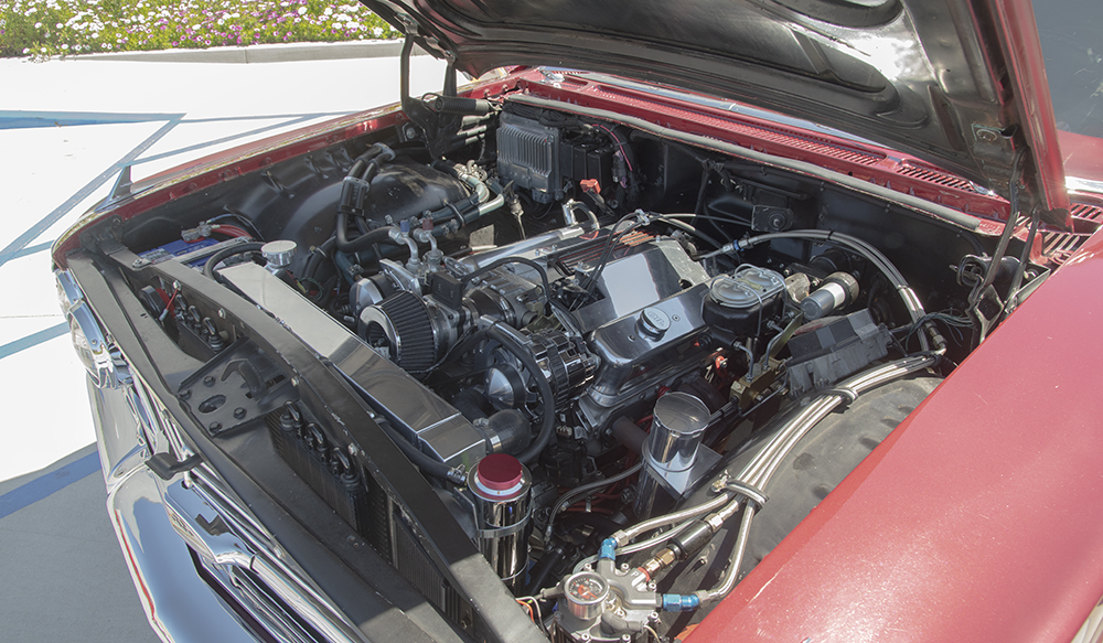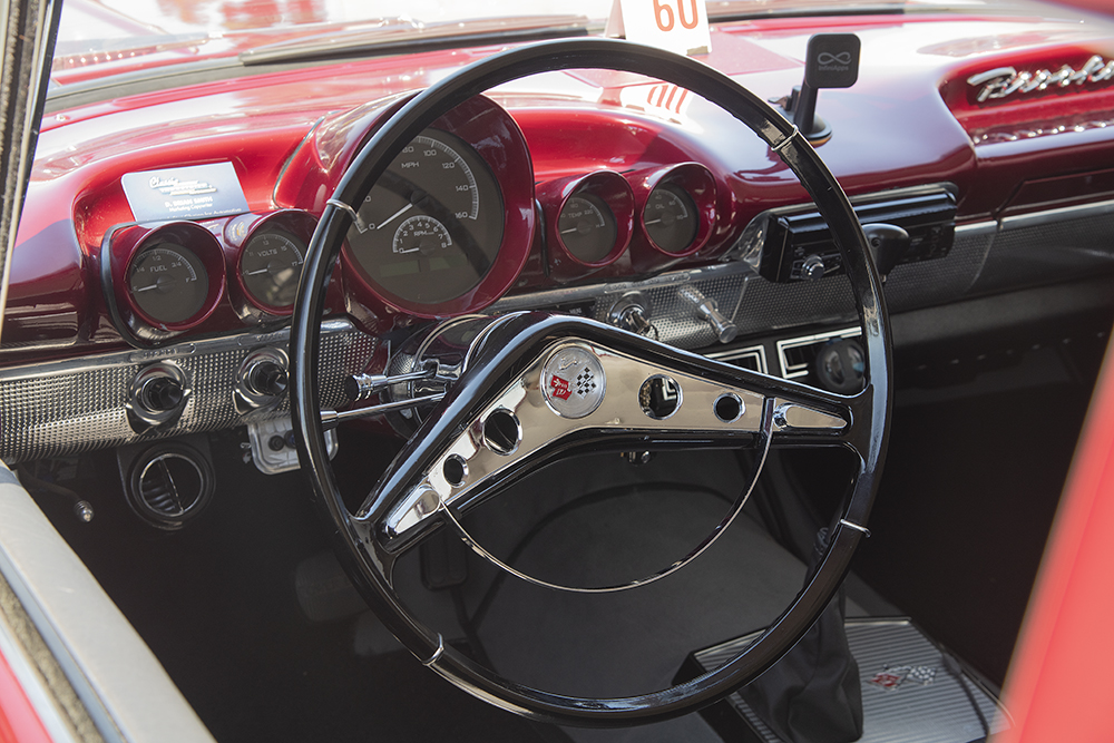 A Dakota Digital gauge cluster replaced the stock instruments, wired in with a Quick Wiring harness. The seats were covered in distressed corona leather and a stock 17-inch 1960 Impala steering wheel completed the vintage-modern vibe.