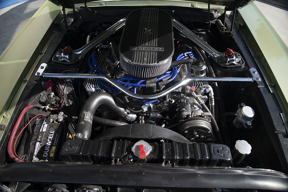 Above: The fiberglass hood has an air inlet scoop the same as 1967 Shelby GT350's and GT500's, but the air outlet vents with the turn signal lights incorporated in the front most louver on either side wasn't a Ford factory Shelby hood. It looks cool though and works well for extracting hot air from the engine bay, according to the owner.