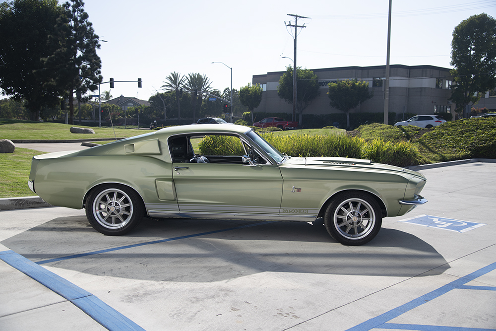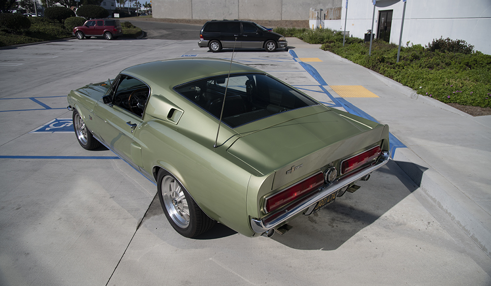 Above: Frank used House of Kolors epoxy primer and HK paint in Limestone Green and clear coats to magically match the existing body panels with the purchased Shelby fiberglass panels. The wheels are reproduction Shelby 10-spokes that are 17x8 inches in the front and the rear. The radial tires are 235/45R17's in the front and 235/50R17's in the rear. Shelby 10-spokes for the 1967-68 Shelby Mustangs were 15-inch wheels originally. The fiberglass Shelby quarter panel scoops and exterior sail panel scoops were scooped up (couldn't resist) at Classic Industries.