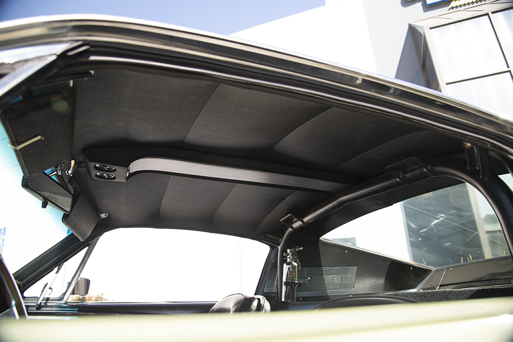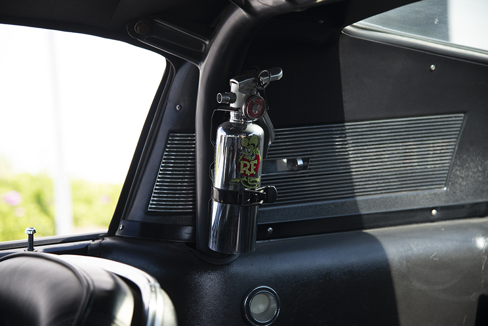 Above: A great place to hang your Rat Fink fire extinguisher is on the roll bar upright. The owner had to cut the rear panel on either side to accommodate the Tony Branda reproduction Shelby roll bar.