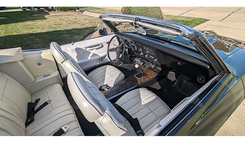 Below: The 1969 Firebird 400 convertible sports a four-speed manual transmission backing its 400-cubic inch V8 engine. She also has white vinyl upholstery, as shown in the lead photo. Most photos courtesy of Mecum Auctions.